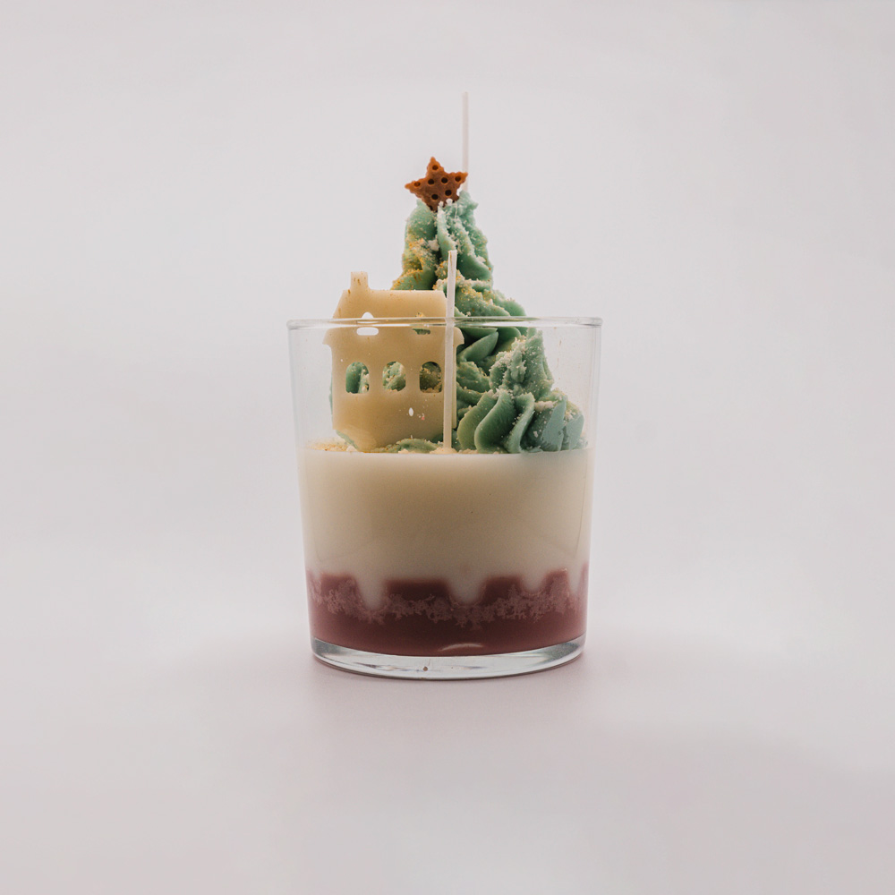 Φυτικό κερί σόγιας με άρωμα κουραμπιέ. Σχέδιο γλυκό με σαντιγί σε ποτήρι και χριστουγεννιάτικο δέντρο.